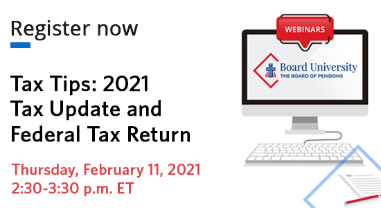 | | |  |  |  |  | Register now for Board University’s annual tax webinar, on Thursday, February 11, 2021. This webinar focuses on tax updates and tips for actively employed members, including clergy. |  |