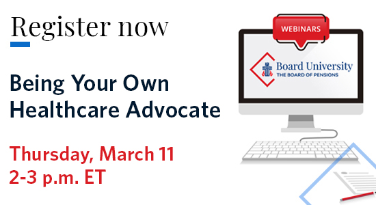 | | | | Register now for Board University’s Being Your Own Healthcare Advocate webinar, on Thursday, March 11, 2021. Participants will learn essential information needed to effectively advocate for their care and to identify resources to help ensure they receive the best possible care and support. | |