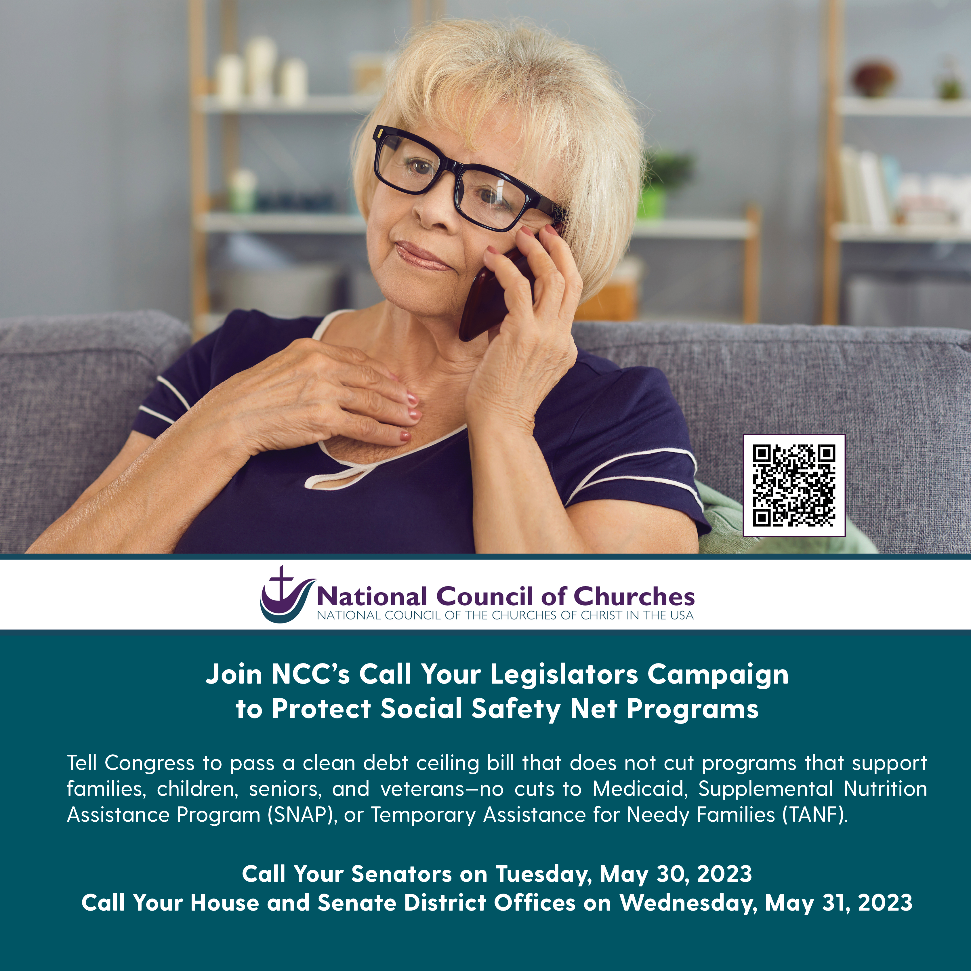 On Thursday, May 25, NCC held the first day of the Call Your Legislators Campaign, which urged NCC member communions, partners, and supporters to call and write their members of Congress and tell them that defaulting on America’s bills is irresponsible, taking food and healthcare from people is immoral, and that they should pass a debt ceiling bill before the June 1 deadline with no conditions. ACT NOW and tell Congress that defaulting on America’s bills is irresponsible, taking food and healthcare from people is immoral, and that a debt ceiling bill must be passed before the June 1 deadline, with no conditions!