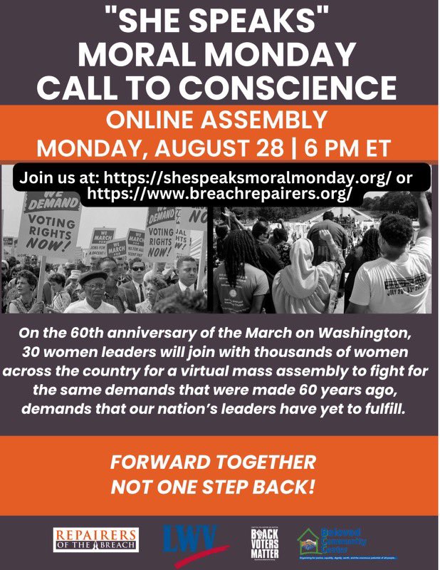 Bishop William Barber extends an open invitation to join, “She Speaks,” Virtual Moral Monday Call to Conscience on August 28, at 6:00 p.m. ET. This event aims to unite diverse speakers and partners to discuss pressing issues related to equality, justice, empowerment, and social change.