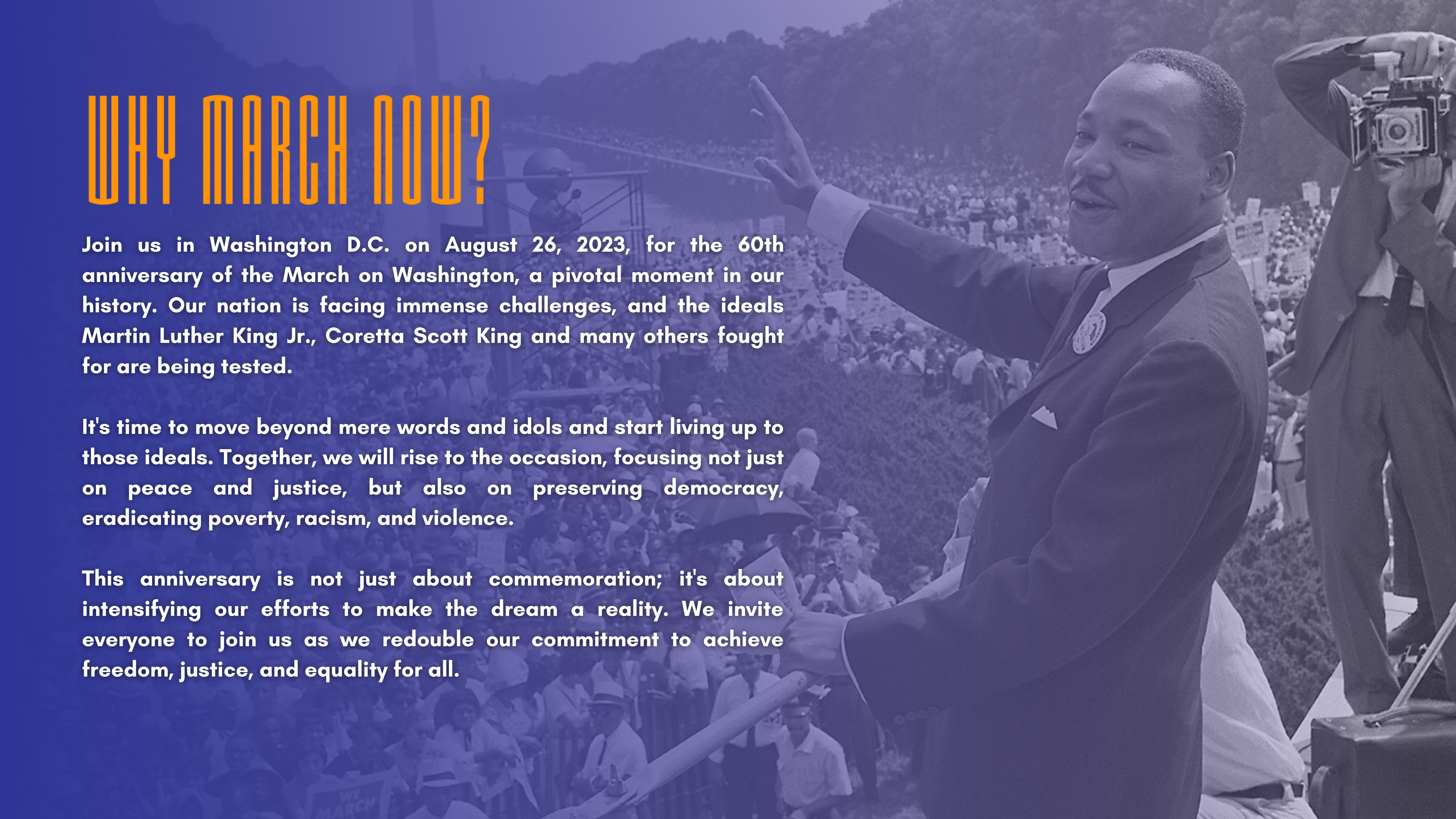 Rev. Al Sharpton, Founder and President of National Action Network; Arndrea Waters King, President, Drum Major Institute; and Martin Luther King, III, Chairman, Drum Major Institute enlist your participation in the 60th Anniversary of the March on Washington to be held August 26, 2023, in Washington, DC to mobilize the faith community across America, for "March on Washington Not a Commemoration, a Continuation!"