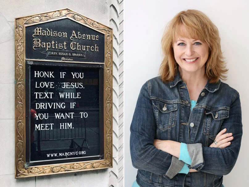 The Rev. Susan Sparks regularly uses comedy both in the preaching and signage at Madison Avenue Baptist Church in New York City. (Courtesy photos) | |