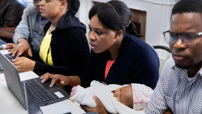 Jimene Admettre, center, sits next to her husband Ernseau, right, and holds her daughter Gabyana while learning computer skills, Friday, Dec. 22, 2023, in a rectory building where they are staying at the Bethel AME Church in the Jamaica Plain neighborhood of Boston. Demand for shelter has increased as Massachusetts struggles to find newly arriving migrants places to stay after hitting a state-imposed limit of 7,500 families in its emergency homeless shelter system last month. (AP Photo/Michael Dwyer) AP | |
