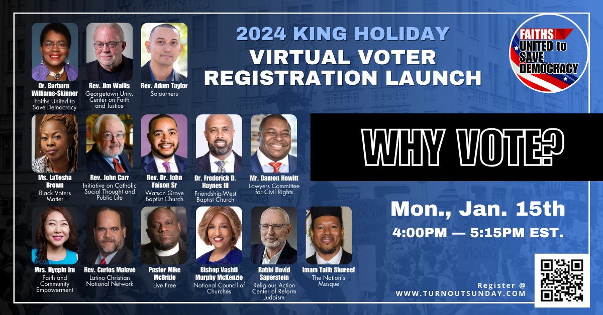 Faiths United to Save Democracy is hosting a virtual Call to Action Voter Registration Launch on January 15, 2024, 4:00 – 5:15 pm/EST. Please help them get the word out about the launch and the powerful January 15 messengers addressing the 2024 election question, "Why Vote?"